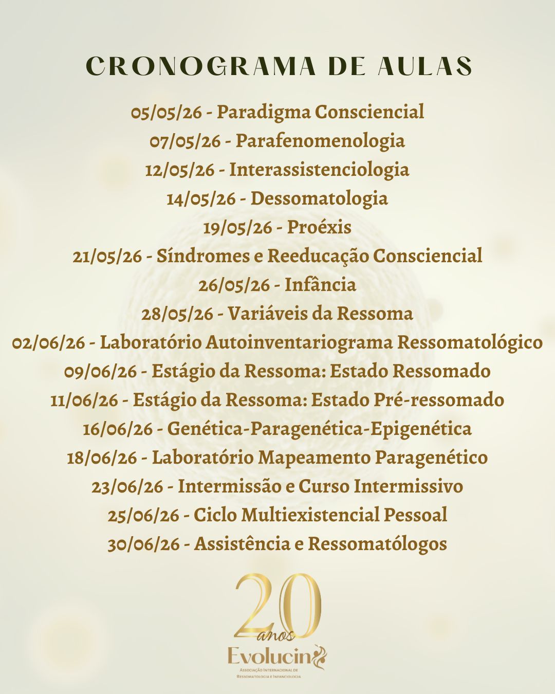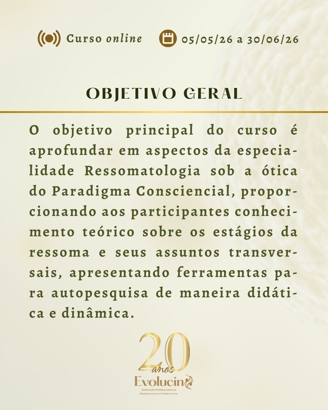 O objetivo principal do curso é aprofundar em aspectos da especialidade Ressomatologia sob a ótica do Paradigma Consciencial, proporcionando aos participantes conhecimento teórico sobre os estágios da ressoma e seus assuntos transversais, trazendo ferramentas para autopesquisa de maneira didática e dinâmica.